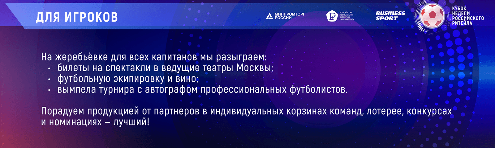 «КУБОК НЕДЕЛИ РОССИЙСКОГО РИТЕЙЛА» является ярким продолжением спортивных мероприятий, проводимых при участии ритейлеров с 2010 года и уже стал настоящим центром притяжения корпоративного спорта всей российской розницы.