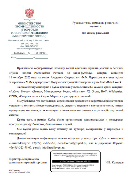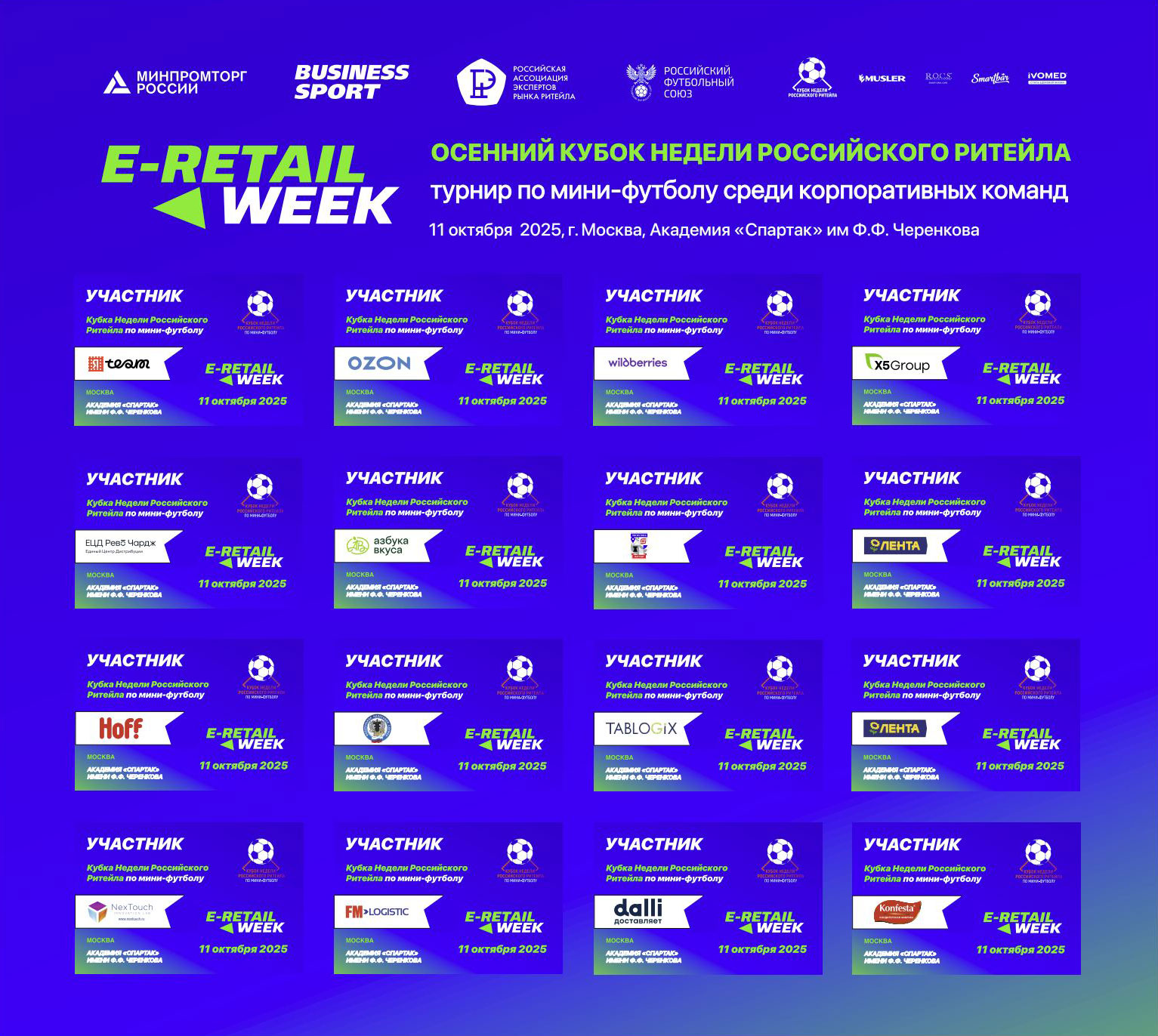 Приглашаем вашу компанию принять участие в ближайшем, осеннем «Кубке Недели Российского Ритейла`25» по мини-футболу, который состоится 11 октября 2025 года на полях Академии Спартак им. Ф.Ф. Черенкова по адресу: Москва, Малый Олений переулок, д. 23.
